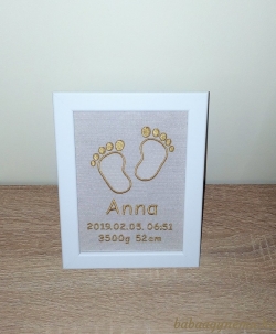"Megérkeztem..." fatábla és hímzett keretes kép, mely a kisgyermek születési adatait tartalmazza.Kiváló meglepetés lehet babalátogatáskor, amely örök emlék az újdonsült szülők számára. További információ
